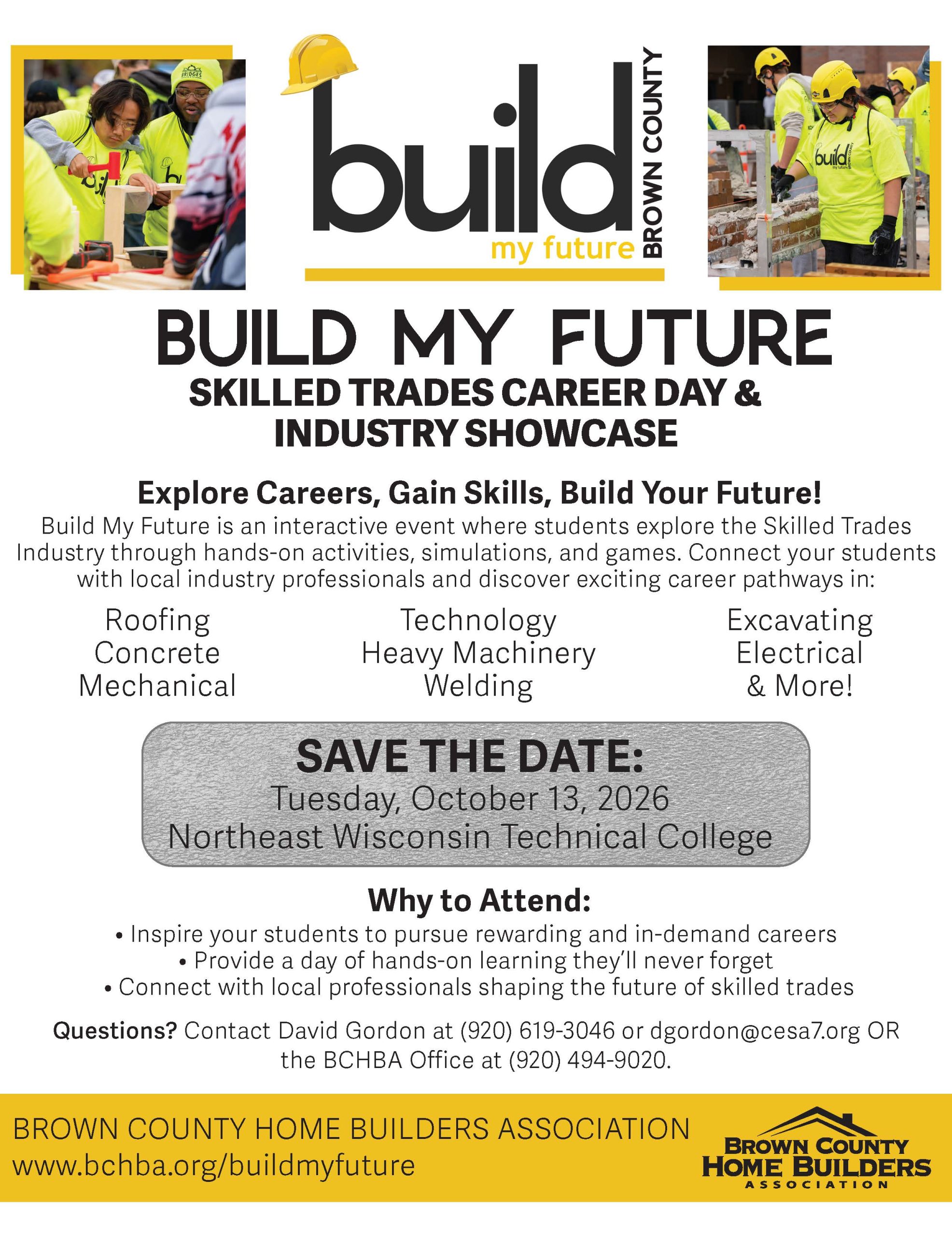 - If you are a school and have questions on students attending the event, Contact David Gordon (dgordon@cesa7.org) or call the BCHBA Office at 920-494-9020.